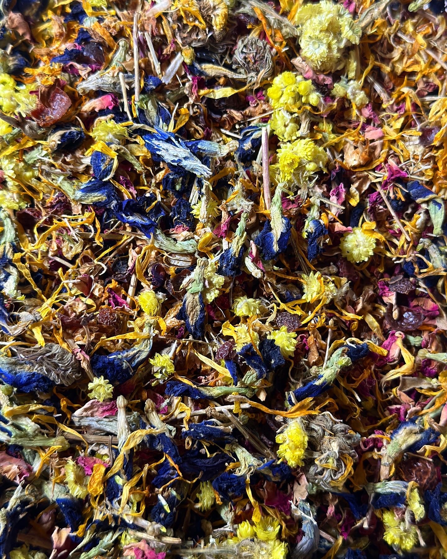 This Apple Cider Vinegar is slow infused with botanicals such as lemon balm, chamomile, roses, calendula, comfrey, lemon peel, butterfly pea, rosemary, sage. Use as a multi-purpose revitalizing bath soak, face toner and hair rinse!